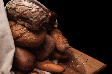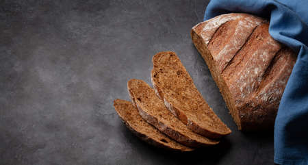 Bread. Homemade whole grain bread on a dark napkin on a dark background copy space.