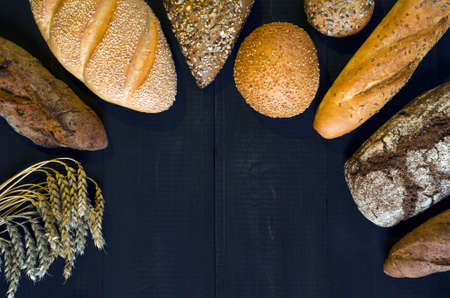 Assortment of bread with spikelets of wheat on dark background with copy space for your text. Top view.