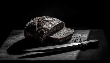 Sliced bread on wooden cutting board. Dark rustic style.