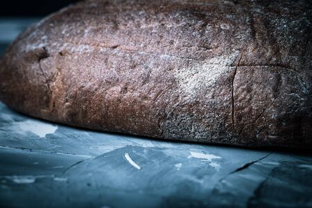 freshly baked black rye bread on a dark background and on craft paper. Dark moody background with free text space. top view