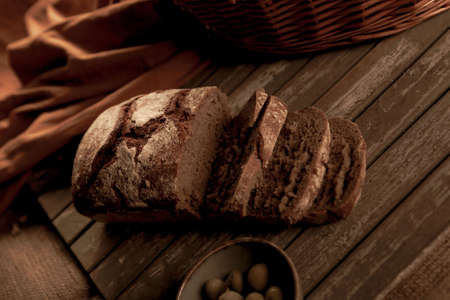 Natural background. Still life- cut slices of rye bread on a wooden table