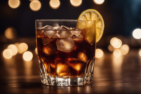 A glass of cola with ice cubes, lemon and bokeh
