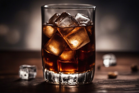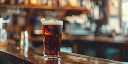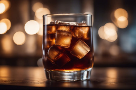A glass of cola with ice cubes on a bar counter.