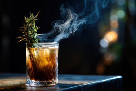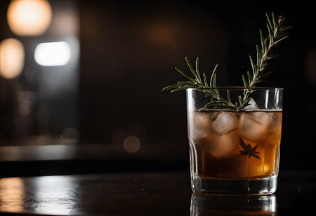whiskey with ice and rosemary on the table in bar