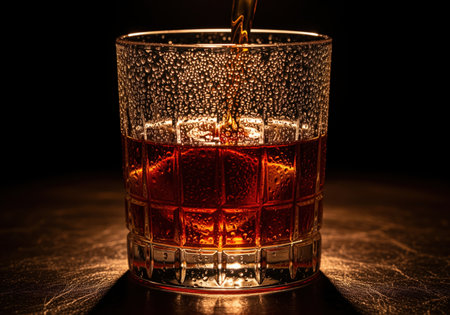 Dark rum pours into a textured, wet crystal glass, illuminated by a warm glow on a dark, reflective surface. evokes a sense of luxury and evening relaxation.