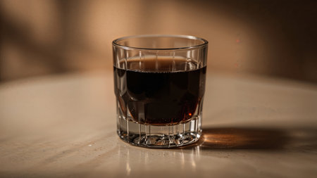 Glass filled with a dark liquid placed on a marble surface, illuminated by warm ambient lighting. Soft shadows create a cozy and elegant atmosphere.