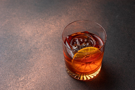 Negroni cocktail with prange slice with shadow on dark background