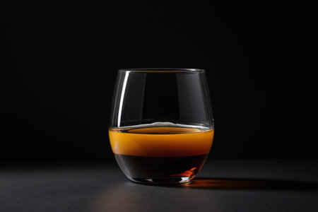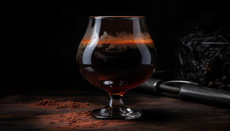 AI Generated. Pouring dark amber beverage glass black background