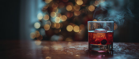 A warm glass of spiced cocktail rests on a wooden table surrounded by soft glowing lights of a decorated Christmas tree evoking holiday cheer.
