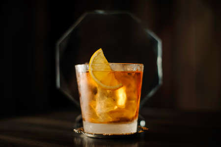 old fashioned classic cocktail in glass on table