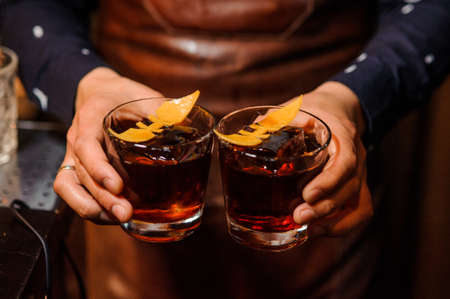 Barman hands holding two glasses filled with alcoholic drink and ice cubes decorated with orange peels