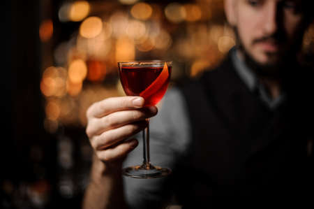 Bartender serving a transparent red cocktail in the glass decorated with a lemon zest on the steel bar counter