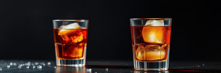 A closeup of a glass of whiskey with ice on a black background