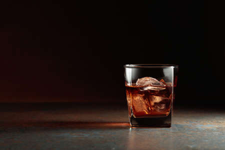 Glass of whiskey with natural ice. Rough rusty background. Copy space.