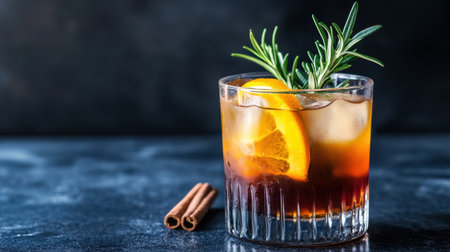 A glass of iced Americano with layers of orange and lemon juice, decorated with rosemary and cinnamon for an elegant touch, on a dark background.