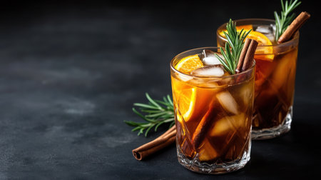 Refreshing cocktails served on a dark wooden table with ice cubes for a relaxing evening
