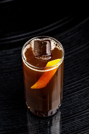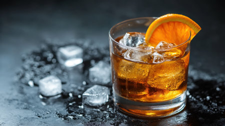 Refreshing drink served in a glass with ice cubes and a slice of orange on a dark background