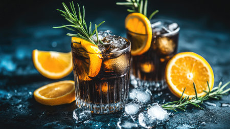 Cuba libre cocktail with orange and rosemary on dark background