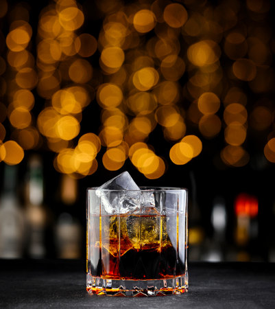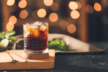Cuba libre cocktail at the bar stand. Dark background. Horizontal. Bold festive bokeh