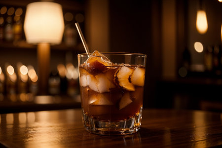 A closeup of a glass of old fashioned cocktail with ice on a wooden table with a blurry background