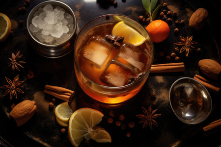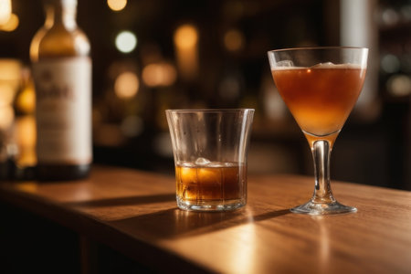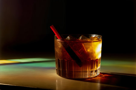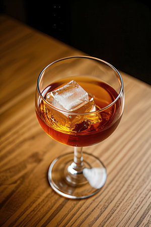 manhattan cocktail on wood table with grain texture, created with generative ai