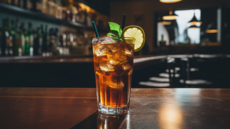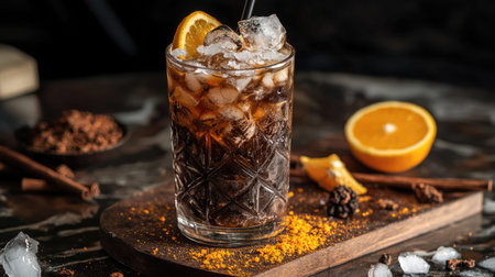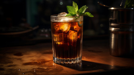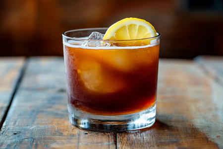 An enticing glass filled with iced drink, featuring a bright lemon slice on the rim, sits on a rough wooden surface. The deep brown liquid glistens under soft light, inviting indulgence.