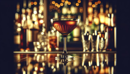 Manhattan cocktail on a bar, multiple reflections in the mirror behind, focus on the drink, soft blur on the surroundings.. AI generated.