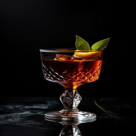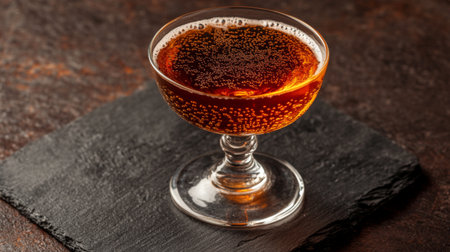 A sophisticated dark cocktail elegantly presented in a crystal glass, garnished with an orange twist, resting on a slate serving board, ideal for upscale events.