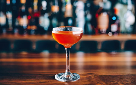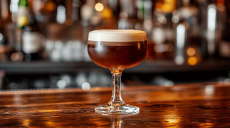 This image showcases an elegant cocktail with a frothy top, artfully served in a stylish glass. The warm ambiance of the bar enhances the drink's appeal, making it perfect for social gatherings.