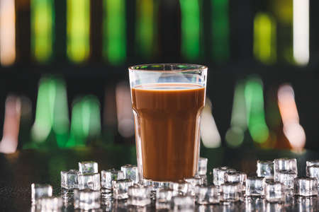 Alcoholic brown cocktail in the glass standing on the wooden table