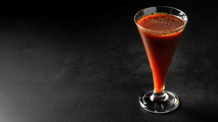 Single tall glass of dark red beverage on black background with space right side