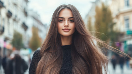 A woman stands with her hair blowing in the wind, showing a dynamic and stylish look.