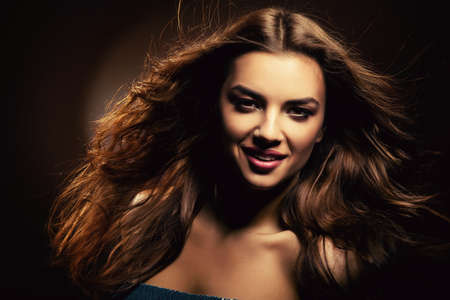 closeup studio portrait of attractive young woman with long brown hair over dark studio background