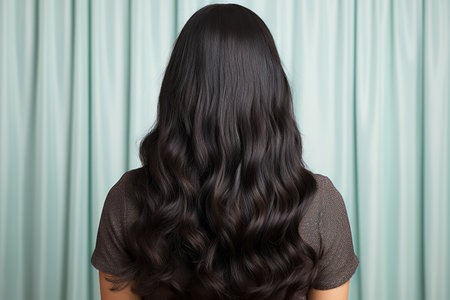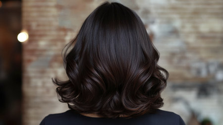 A captivating view of beautiful dark wavy hair showcasing soft curls and shine. The elegant hairstyle offers a glimpse into modern fashion and beauty trends.