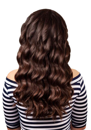 Back view of brunette woman with long dark curly hair isolated on white background. Long curly hair. Curly hair isolated on white background