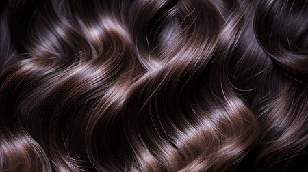 Black hair close-up as background. Women's long natural dark hair. Girl with wavy shiny curls AI generated image