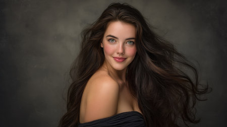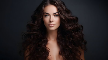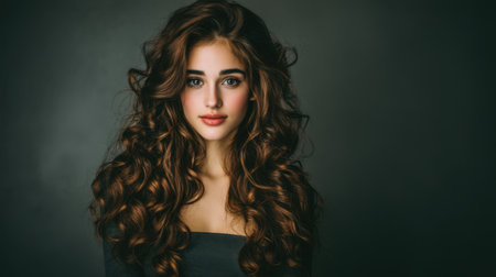 Young woman with long, voluminous curly hair poses against dark background, exuding confidence and beauty. Her expressive eyes and soft features create captivating portrait