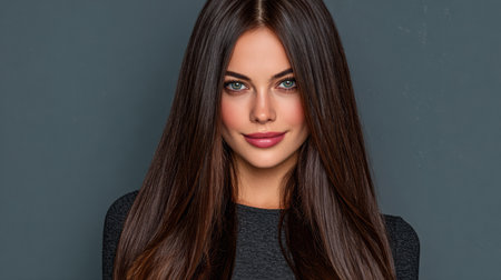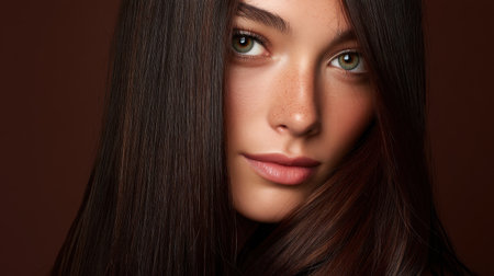 Close up portrait of young woman with long, straight hair and striking green eyes. Her skin has natural glow, and she displays subtle expression that conveys confidence and beauty. background
