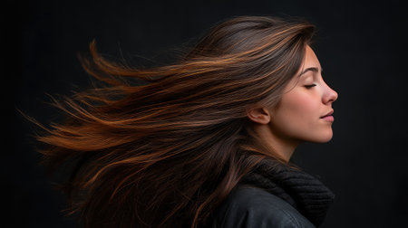 This captivating portrait features a woman with flowing hair in motion against a dark backdrop, highlighting her natural beauty and grace while embodying elegance and tranquility.