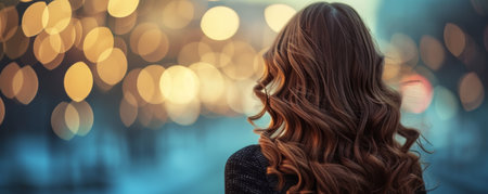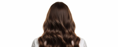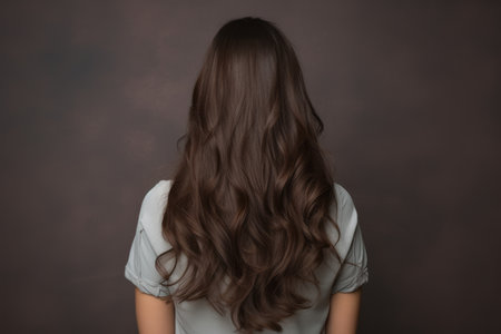 Woman with long wavy brown hair, rear view portrait. Haircare and beauty concept
