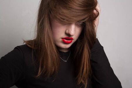 Studio portrait of a young girl with her face covered with hair. The concept of an insoluble problem, nervous tension.