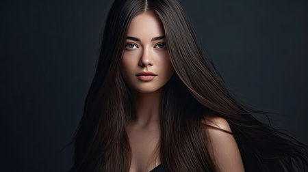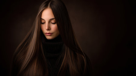 A captivating portrait of an elegant young woman with long flowing hair. The soft lighting enhances her serene expression against a dark backdrop, creating a timeless and artistic atmosphere.