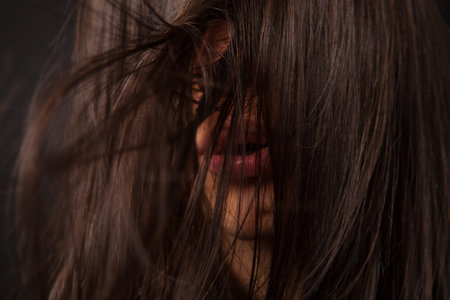 Moody portrait of a woman with wind-swept hair, capturing her intense gaze and natural beauty against a dark background.
