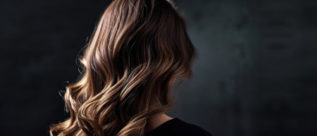 Close-up of a brunette woman's hair with loose curls on a black background. Hair is styled in loose curls and looks shiny and healthy. This image is perfect for projects related to hair care and beauty.