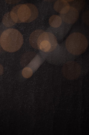 Abstract bokeh texture background with orange and brown circles from a garland on a dark antique backdrop close up. Circles of different sizes, blurred and out of focus. Free space for text.