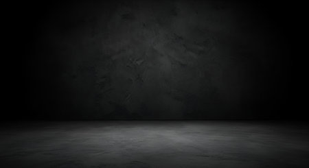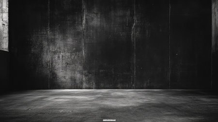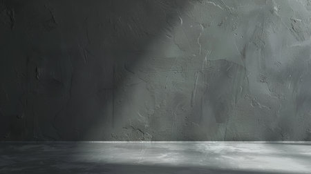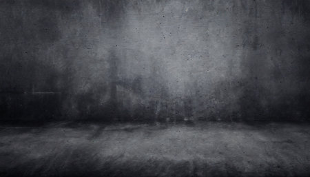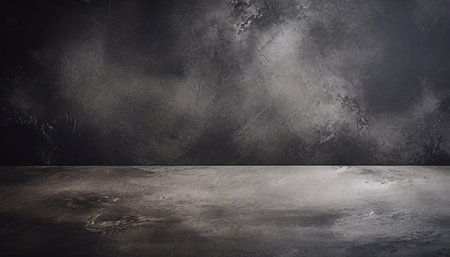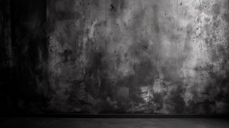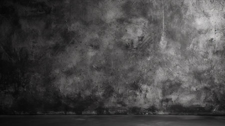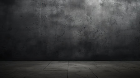 This dark and textured background features a grungy concrete wall and floor, ideal for various design projects, photography, and artistic displays in minimalistic styles.