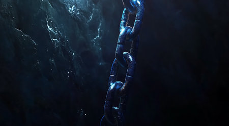 Dramatic dark blue chain in shadowy depths with textured backgrounds evokes mystery and strength.