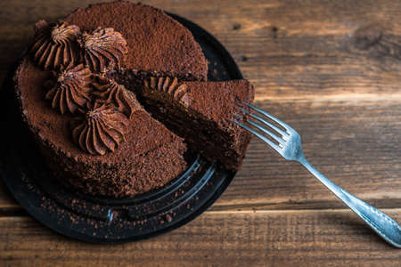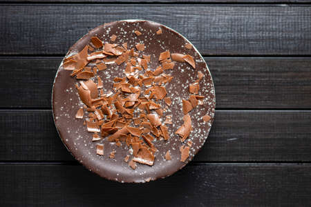 Sweet chocolate cheese cake on black wooden table. Top view.