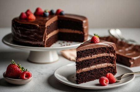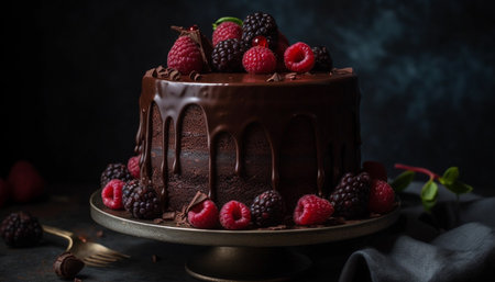 Indulgent chocolate cake slice with fresh berry decoration and homemade icing generated by artificial intelligence
