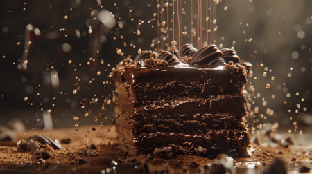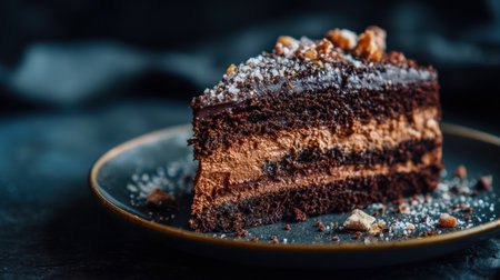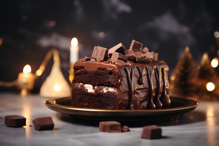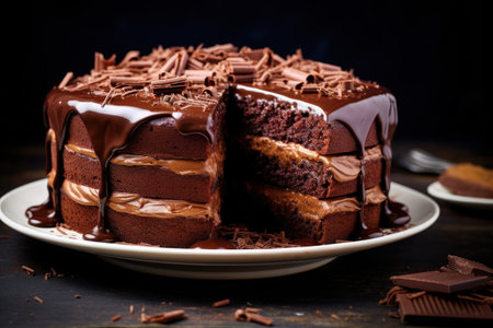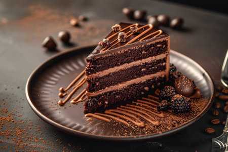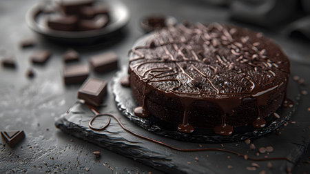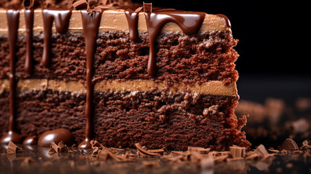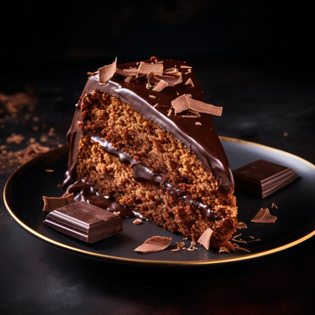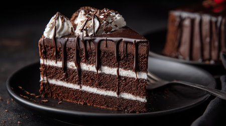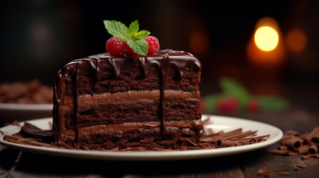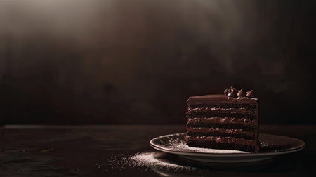 chocolate cake delicately placed on a plate, set against the backdrop of a cut chocolate cake on a dark background, illuminated by low key lighting for a tantalizing visual treat